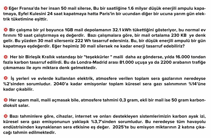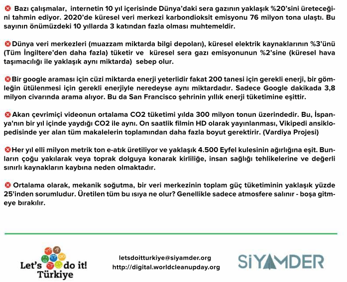 Daha az dijital fazlalık zaman kaybını azaltıp odaklanmayı da arttırıyormuş. Ama en önemlisi dijital aletlerimizdeki kullanmadığımız dosyaların bir çevre etkisi de var, yani dijital temizlik ekolojik bir hareket aynı zamanda. Kampanya için paylaşılan bilgilere göre internet ve onu destekleyen sistemlerin karbon ayak izi havayolu sektörünün küresel olarak ürettiği sera gazı miktarına yakınmış. Let’s Do It tarafından derlenen bilgiler şöyle: